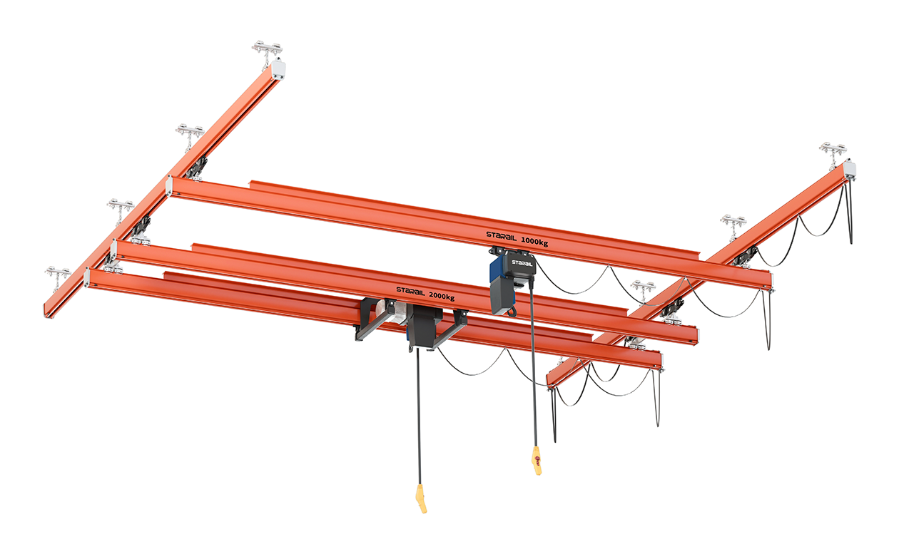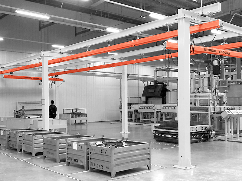 KBK cranes include various types of cranes, including monorail, single-beam, double-beam, and telescopic-beam cranes. With a flexible lifting capacity of 0.125t-2t, they are widely applicable, especially to modern production conveyor lines. The lifting system is lightweight and flexible, with good reliability and high stability. All components are standard modules, ensuring high-volume, high-quality production and easy maintenance. KBK tracks and standard modules can be used simply by bolting them together. This makes installation easy and economical, significantly saving factory space and area, thereby saving costs, improving efficiency, and further increasing corporate profits.